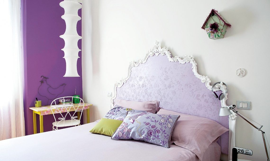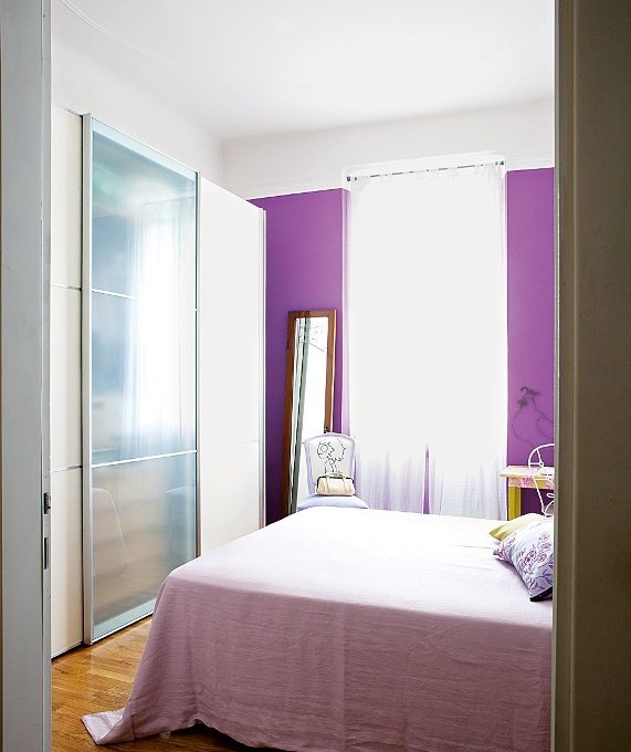 Il viola è il secondo colore preferito di Antonella, scelto per la camera. Non per caso è un complementare del verde e quindi vi si abbina perfettamente. Una parete sola è viola scuro, quella della finestra, dove non batte la luce naturale, in modo da non abbassare la luminosità dell’ambiente. Tutto il resto è un piacevole gioco di sfumature dal lilla al rosa.