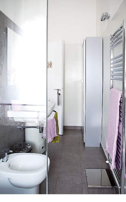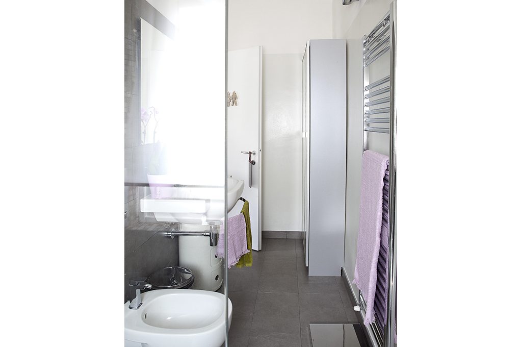 Come capita il più delle volte nelle case di qualche decennio fa, il bagno è di forma allungata (cm 126x334). Non potendo allargarlo per non sacrificare l’angolo cottura, e non volendo allungarlo per non rinunciare al ripostiglio, si è ottimizzato lo spazio spostando i sanitari quando si è rifatto l’impianto. La doccia, per essere più grande, ora è sotto la finestra, con rivestimento in mosaico Bisazza, miscela Osaka, e parete di vetro di Vismaravetro. I sanitari sono allineati: lavabo SpaceBall (Ceramica Globo); bidet e wc Quinta (PozziGinori); rubinetti Mare (Fantini); radiatore cromato Ares (Irsap). Il mini-armadio davanti alla porta è una Billy (Ikea, cm 80x28x202h €39,33) a cui son state aggiunte due ante, che poi Antonella ha rivestito in carta da parati di Jannelli e Volpi. Mobiletto bianco Componibili di Kartell. Sul lavabo: tazza Richard Ginori (La Rinascente Design Supermarket); orologio Cronotime di Pio Manzù (Alessi, fuori produzione); applique Talo (Artemide, da €214,63); bilancia elettronica SG75 con display a led (Alessi €115).