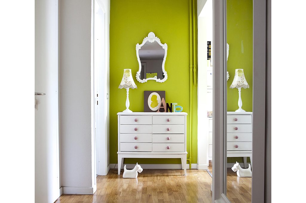 L’entusiasmo e la voglia di far da sé di Antonella sono dichiarati fin dall’ingresso. La cassettiera della nonna, infatti, è opera sua. L’ha sistemata e verniciata di bianco, con colore acrilico. Tocco finale: i nuovi pomoli in ceramica viola, da Zara Home. Specchio (€250) e abat-jour (Nap Atelier, €230) con paralume in tessuto a fiori Designers Guild, mentre il quadro l’ha realizzato lei stessa con un pezzo di carta da parati Clarendon Folia di Osborne&Little; lettere in ceramica di MV% Ceramics Design (da JV Store, €25).