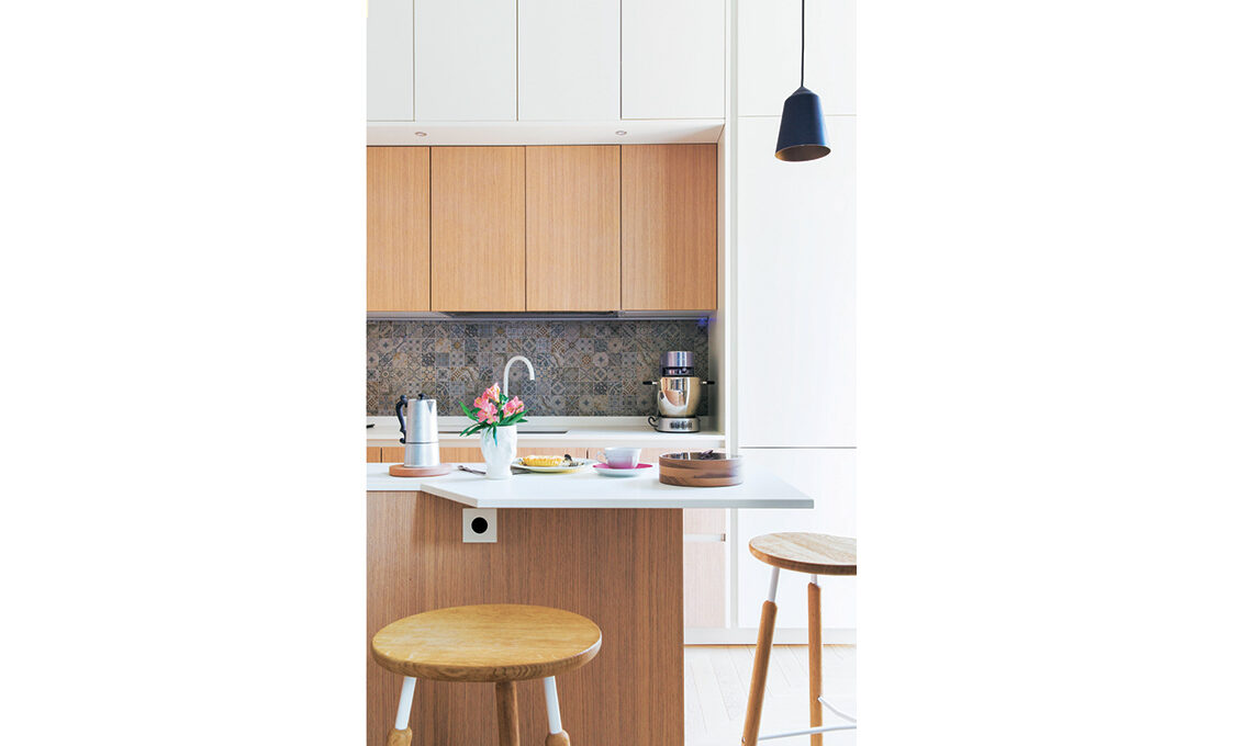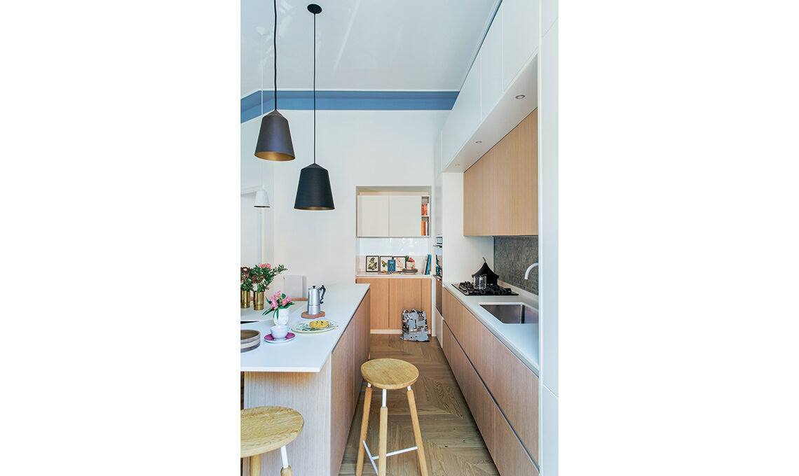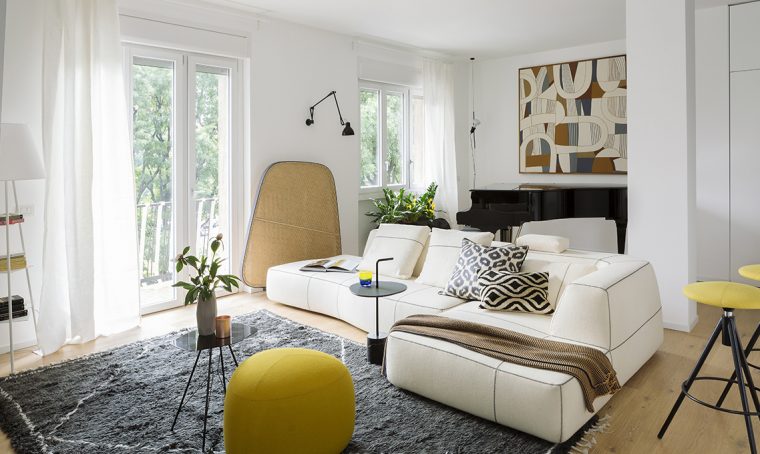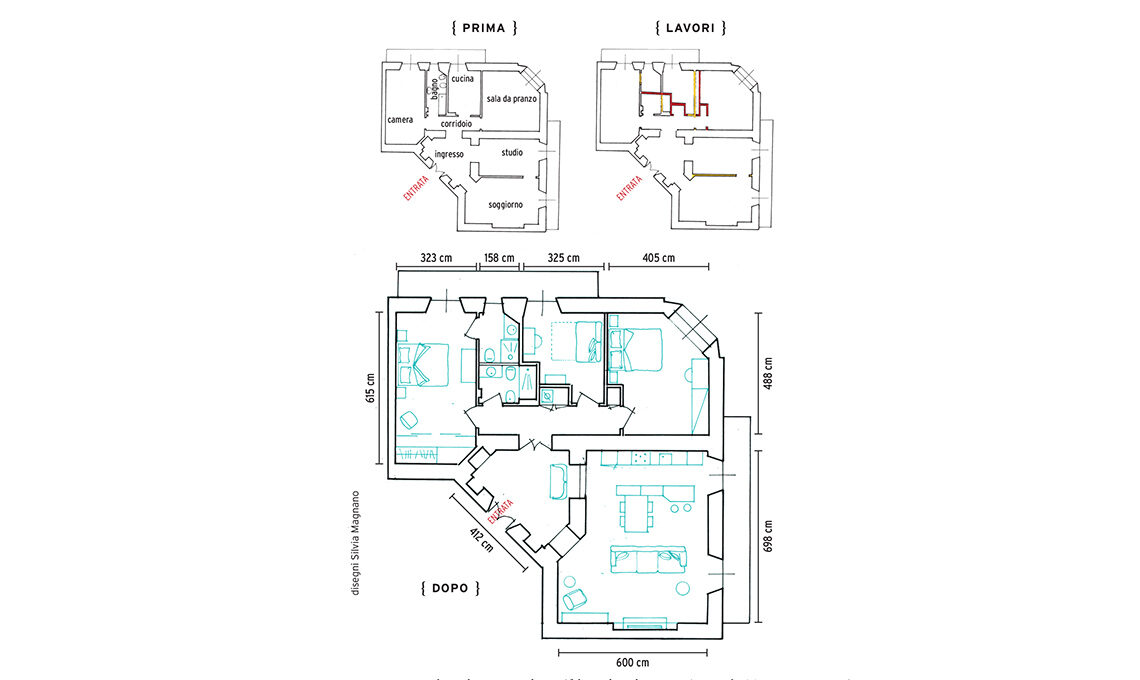 Per rendere più attuale la disposizione dei locali, le zone notte e giorno sono state divise: al posto delle ex cucina e pranzo sono stati ricavati lo studio e la seconda camera, il bagno si è sdoppiato e ora ci sono una cabina armadio e una lavanderia in più; il maxi living con cucina ha preso il posto dello studio e del salotto. Al centro, un bellissimo ingresso ‘a diamante’.