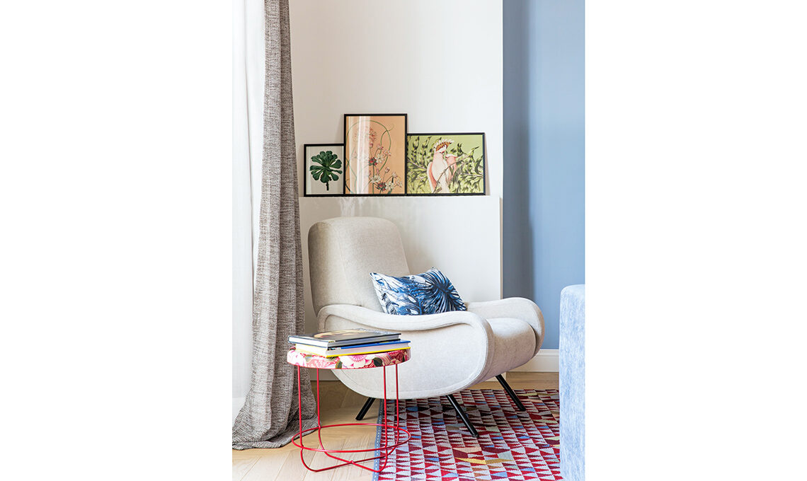 Poltrona bianca Anni ’50 realizzata da [Ikonos Roma] con tavolino Ukyo, dal top rivestito con tessuti dei kimono co-stampati con resina di poliestere e struttura in acciaio rosso [Moroso, ø cm 42x40h €476]. Sopra il termosifone, quadretti a tema floreale e animale [Vanilla Fly].