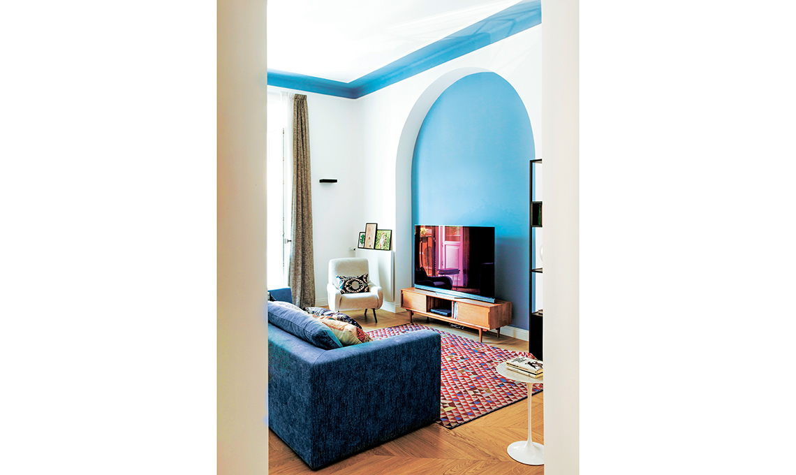 Per creare un punto focale nel living, gli architetti hanno pensato di dipingere il fondo della nicchia con una nuance di azzurro chiaro che si coordina alla perfezione con le altre tonalità presenti nel locale.