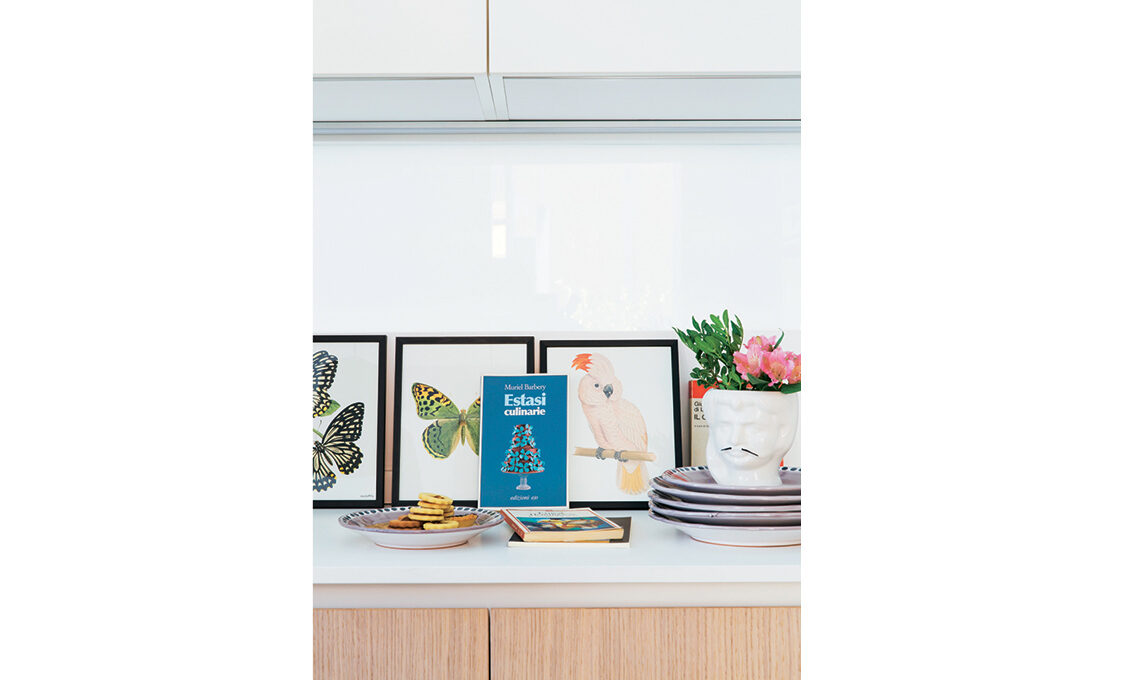 Cucina Lab13 in laccato bianco opaco e rovere sabbia e top in quarzo bianco [Aran], fascia in piastrelle Terre Nuove Caleido Light [Ceramica Sant’Agostino, cm 30x30]. Tagliere in larice e acciaio S/Lab94[ø cm 4 €155] e il centrotavola Barrique [cm 28x50 €147], tutto [KnIndustrie].
