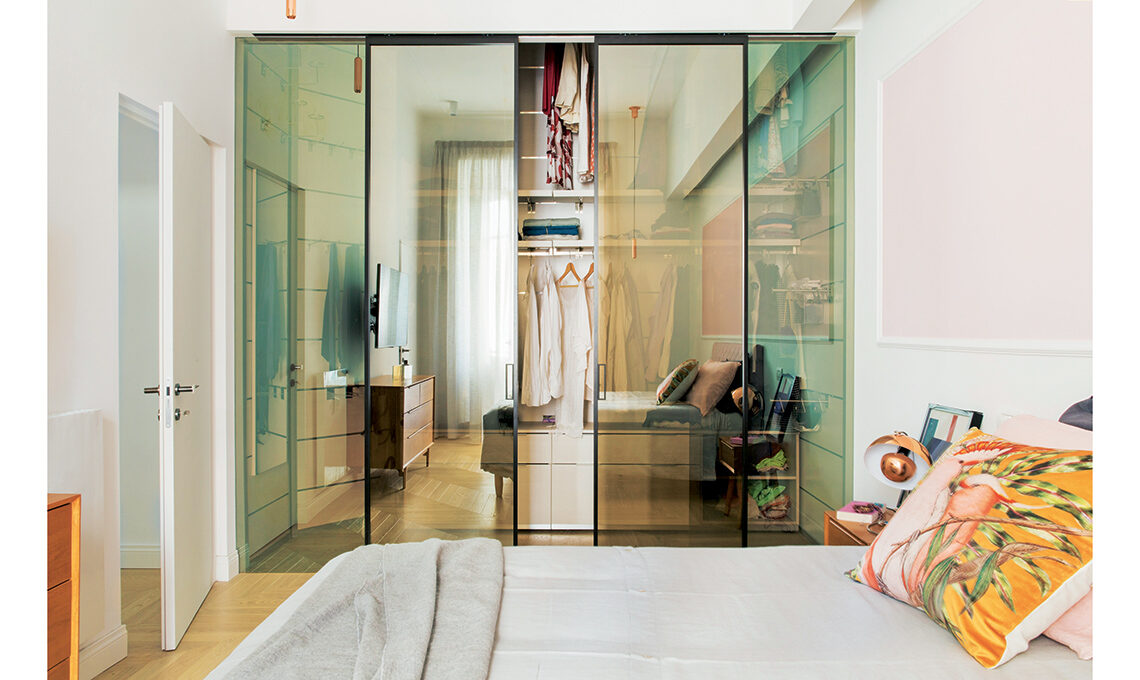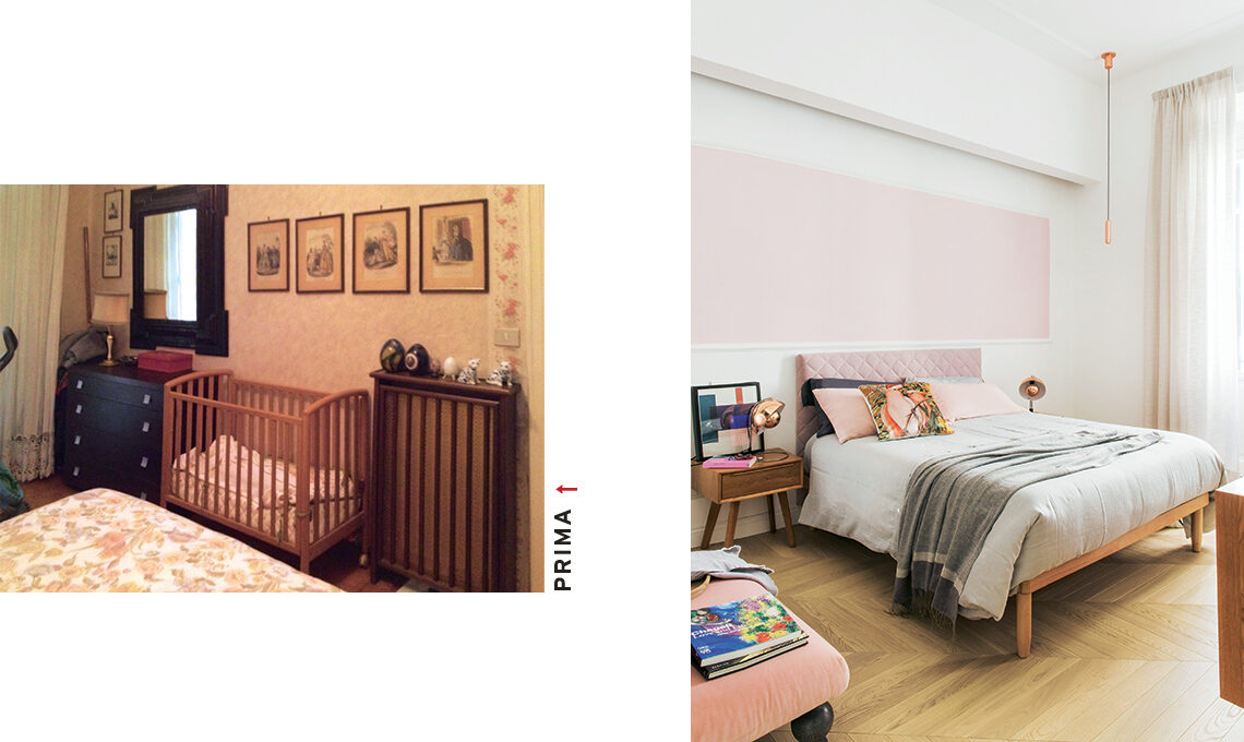 La camera da letto padronale è l’unico locale, ingresso a parte, a essere rimasto immutato nelle dimensioni. Qui è stato fatto un grande lavoro di restyling che ha portato alle tonalità pastello di letto, parete e pouf abbinate a complementi di gusto vintage che convivono perfettamente con il design contemporaneo della cabina armadio.