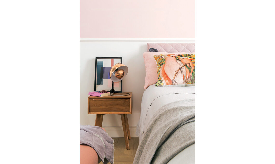 Sul letto, lenzuola e federe di [Fazzini] e cuscino fantasia [Vanilla Fly]. Sui comodini in quercia Portobello [Maisons du Monde, cm 45x35x52h €149 cad], lampade Flowerpot vintage [&Tradition] e stampe [Paper Collective]; sospensione Brixton Spot 50 [Innermost].