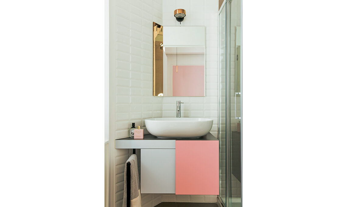 Sul mobile bagno realizzato su progetto come lo specchio rettangolare, lavabo da appoggio Pass 62 [Ceramica Flaminia], con rubinetto Pan finitura cromo lucido [Zucchetti], piatto doccia New Verso da cm 90x72 [Catalano] con box doccia Free angolare in cristallo extrachiaro [Disenia]. A parete, mattonelle in grès smaltato bianco serie Tavella Diamante [Tonalite]; a terra, piastrelle in grès porcellanato SistemN neutro tortora [Marazzi].
