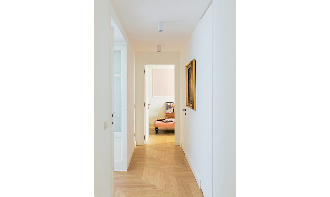 Il corridoio ha il soffitto ribassato: per alleggerire il locale, le luci a soffitto sono piccole e dal design minimale. Parquet in rovere spazzolato finitura Sahara posato a spina francese con battiscopa modanato laccato