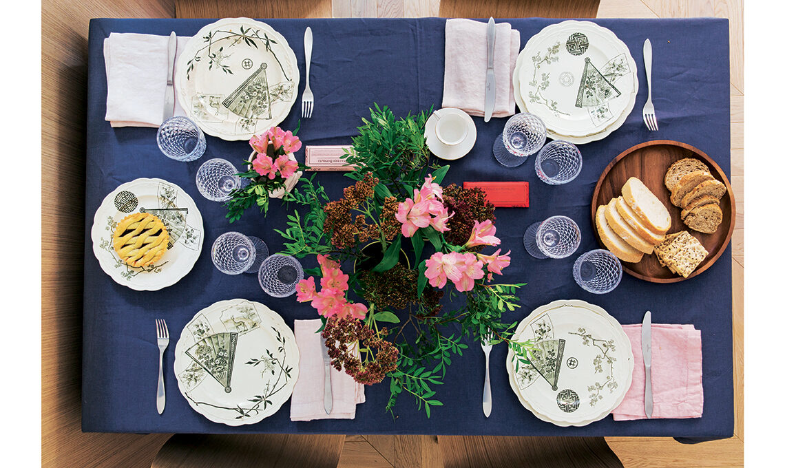 La tavola per quattro commensali è apparecchiata con una tovaglia in lino blu che fa da sfondo ai piatti fine ’800 Oriental Ivory serie Miako [da Spazio Ampio, €35 cad], ai tovaglioli in lino chiaro [La Fabbrica del Lino] e al vassoio in legno portapane di [KnIndustrie].