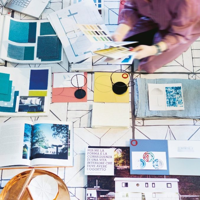Una maxi moodboard, quella creata da Cristina appoggiando a terra, sulla carta da parati [Wall&Deco], le cartelle colore [Il Ladro di Fragole] e i campioni di tessuto [Kvadrat]. Per giocare con la naturale luminosità dell’appartamento, la stylist ha scelto una palette di azzurro-verdi scaldata da tocchi giallo-ramati e tessuti morbidi a contrasto con le geometrie definite dei mobili.