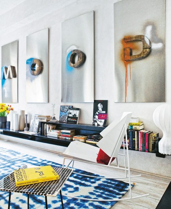 Poltrona a dondolo Terra in lamiera e tubolare [Atipico, cm 95x66x83h €634], libreria pensile nera in ferro [Brancalab] con vasi di Rina Menardi. Tappeto Dye Dye [Kasthall, cm 195x300 €4.211], tavolino da Emporio Roma. opera a parete Mood di Stefano Branca.