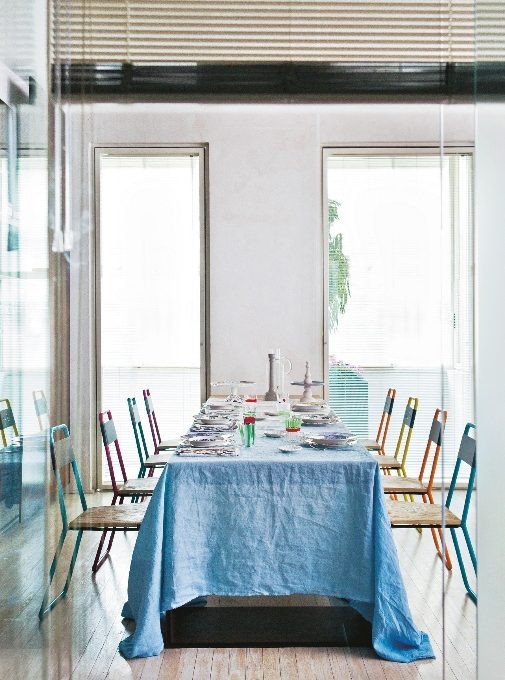 Il maxitavolo, realizzato su disegno in ferro e legno, è di Brancalab come le sedie, per otto, dieci persone. Posizionato perpendicolarmente alle porte-finestre del terrazzo, crea una fuga prospettica minimalista ma ipercolorata: le sedie in tubolare d’acciaio sono tutte in nuances diverse e spiccano sul pavimento in larice. A contrasto con la linearità del tavolo e la geometria definita delle sedie, Cristina ha deciso di vestire la tavola con il tessuto in puro lino stropicciato Saraille Lapis [Designers Guild, cm 305h €1 92/m].