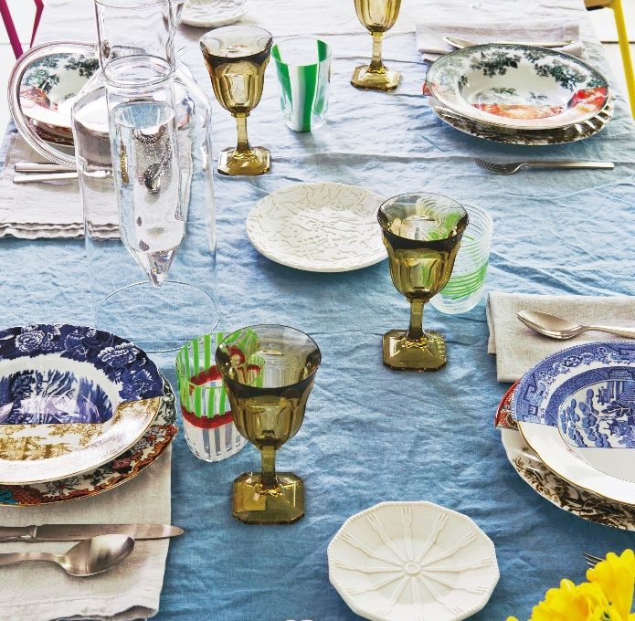 Piatti Hybrid [Seletti da Emporio Roma, da €42], piattini bianchi [Studio Job da Mia Via Ripetta €65 cad], calici Belle Epoque [Guzzini €6,90 cad], bicchieri Bora [Carlo Moretti €104 cad], posate [Sambonet], tovaglioli [La Fabbrica del Lino], vaso [Secondome].