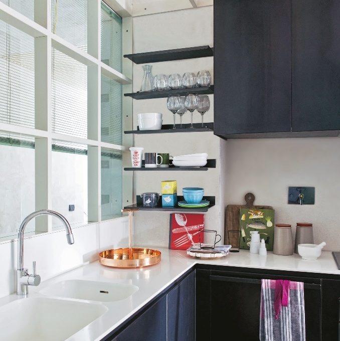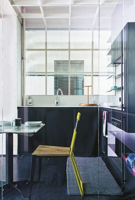 La piccola ma attrezzatissima cucina ricavata in un angolo del soggiorno è realizzata su disegno con ante e ripiani in metallo nero più, a contrasto, un sottile top in Corian® bianco. C’è posto anche per una zona colazione organizzata con tavolino da bistrot e sedie. La parete che si affaccia sul corridoio da un metro di altezza fino al soffitto è chiusa da una vetrata di tipo industriale montata su griglia metallica bianca [tutto Brancalab].