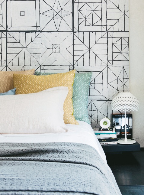 Al posto della testiera, è stata appesa a parete, come fosse un quadro, la tappezzeria grafica in bianco e nero Upsidedown [Wall & Deco €84/mq]. Sul letto sono appoggiati i cuscini Carré in giallo e menta con decoro a esagoni [L’Opificio, cm 65x65 €125 l’uno] e un copriletto grigio traforato [Emporio Roma da €195].