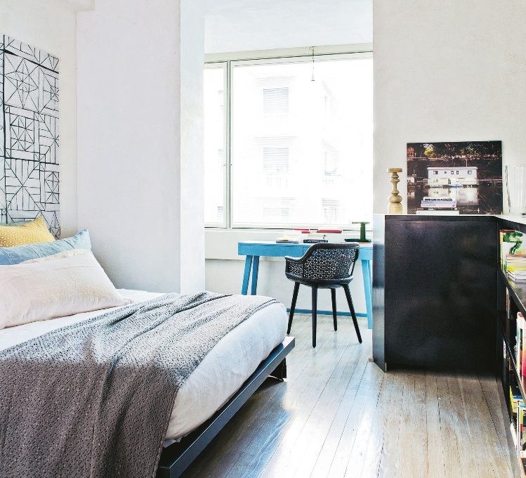 Dove una volta c’era il terrazzo, chiuso regolarmente già anni fa, è stato ricavato uno studio letteralmente invaso dalla luce. Al centro, lo scrittoio Grey 50 tinto avio con due cassetti [Gervasoni, cm 130x45x75h €1.274], accompagnato dalla poltroncina Cyborg in policarbonato con schienale in midollino [Magis, cm 56x54x82h €496]. Sul top, quaderni [Fabriano Boutique] e lampada [Flos]. Sul mobile di fronte al letto [Brancalab], fotografie [Another Studio], candelabro [Emporio Roma] e oggetti [DOM].