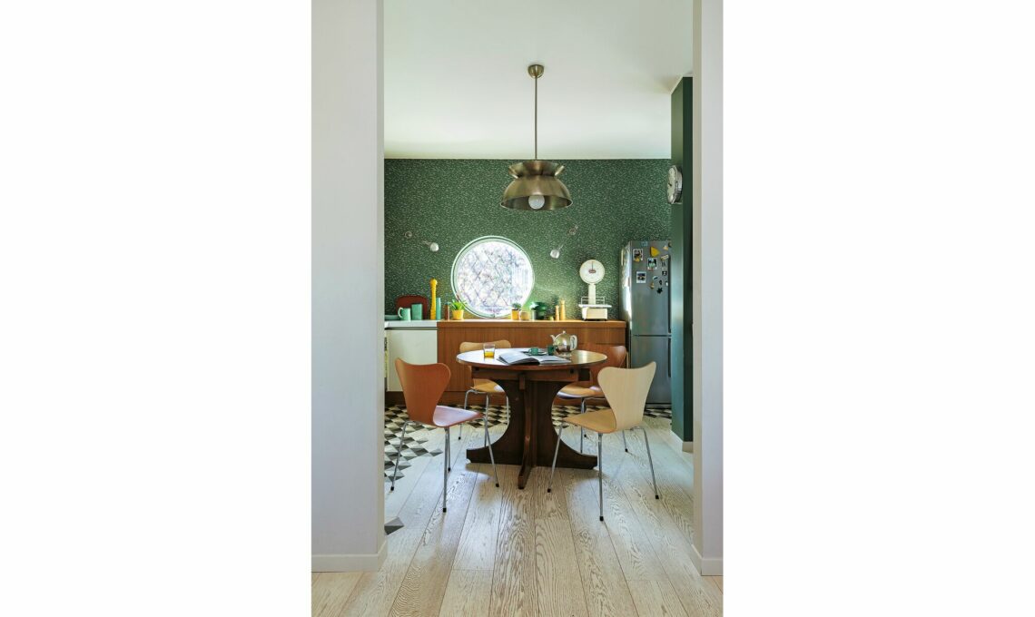Carta da parati Yukutori [Farrow & Ball da Marino Decorazioni €161 il rollo da cm 53x10 m] e lampade Jieldé a due braccia [da Le Civette sul Comò €258 cad]. Attorno al tavolo vintage, sedie Serie 7™ [Fritz Hansen, cm 50x52x82h €495].
