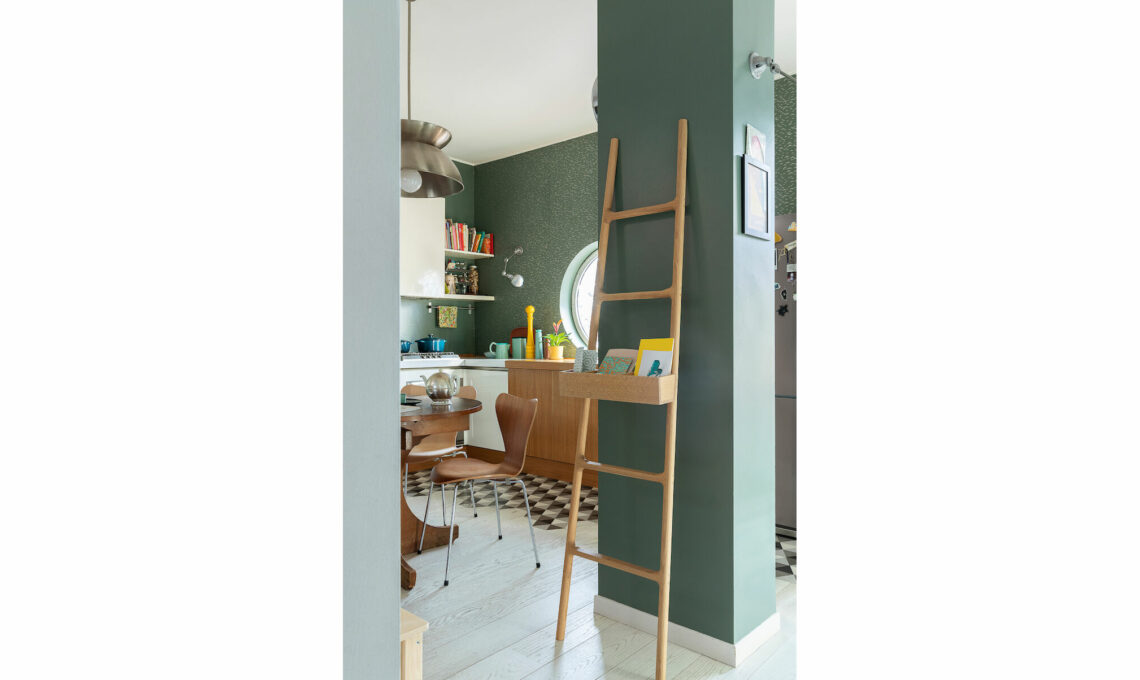 Scaletta Tilt in rovere con portaoggetti [Discipline,cm 47x192h e cm 44x11x9h da €866]. Il verde di base della tappezzeria è stato ripreso anche sulle altre pareti su cui è stato steso uno smalto lavabile, facile da pulire.