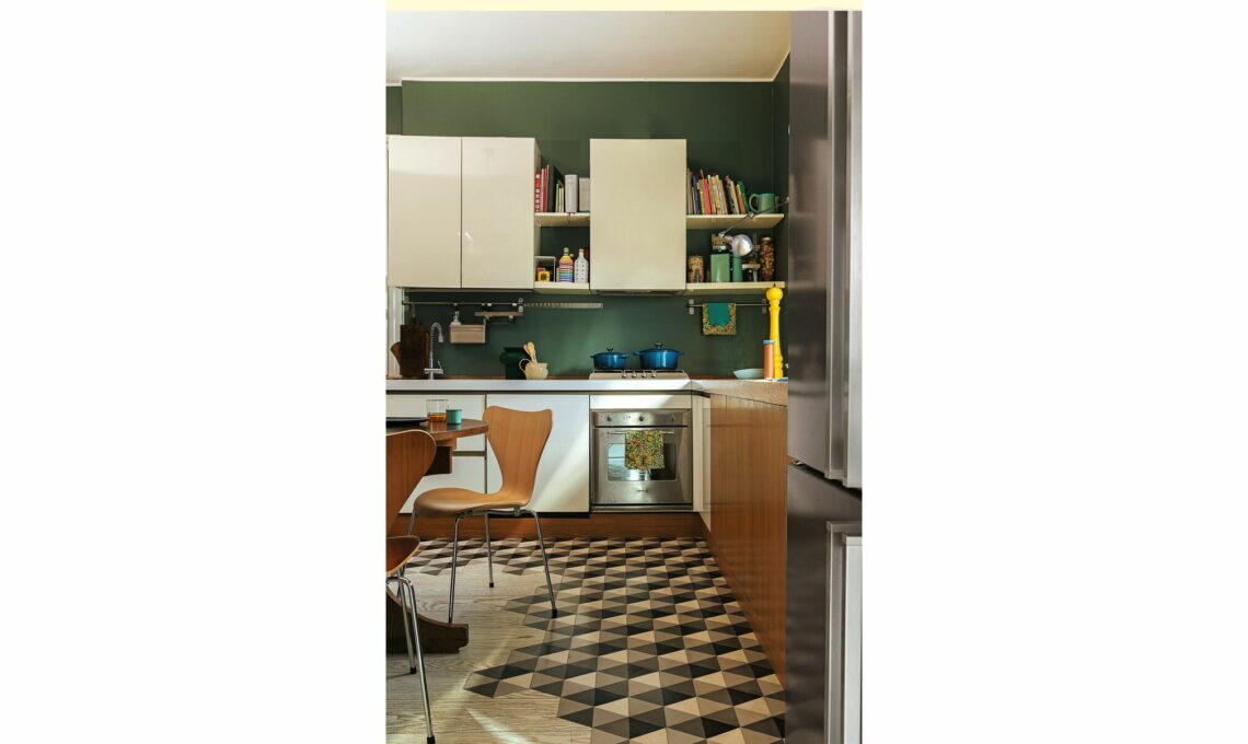 Nella credenza vintage rimessa in forma e dipinta da Giorgia, cementine vendute nel suo negozio [Petit Pan da Le Civette sul Comò, cm 20x20 €12 cad], vasi in vetro color ambra da [Walter Fiori] e in ceramica di [CeramicheMilesi]. Nell’angolo, lampada Parentesi [Flos da €320].