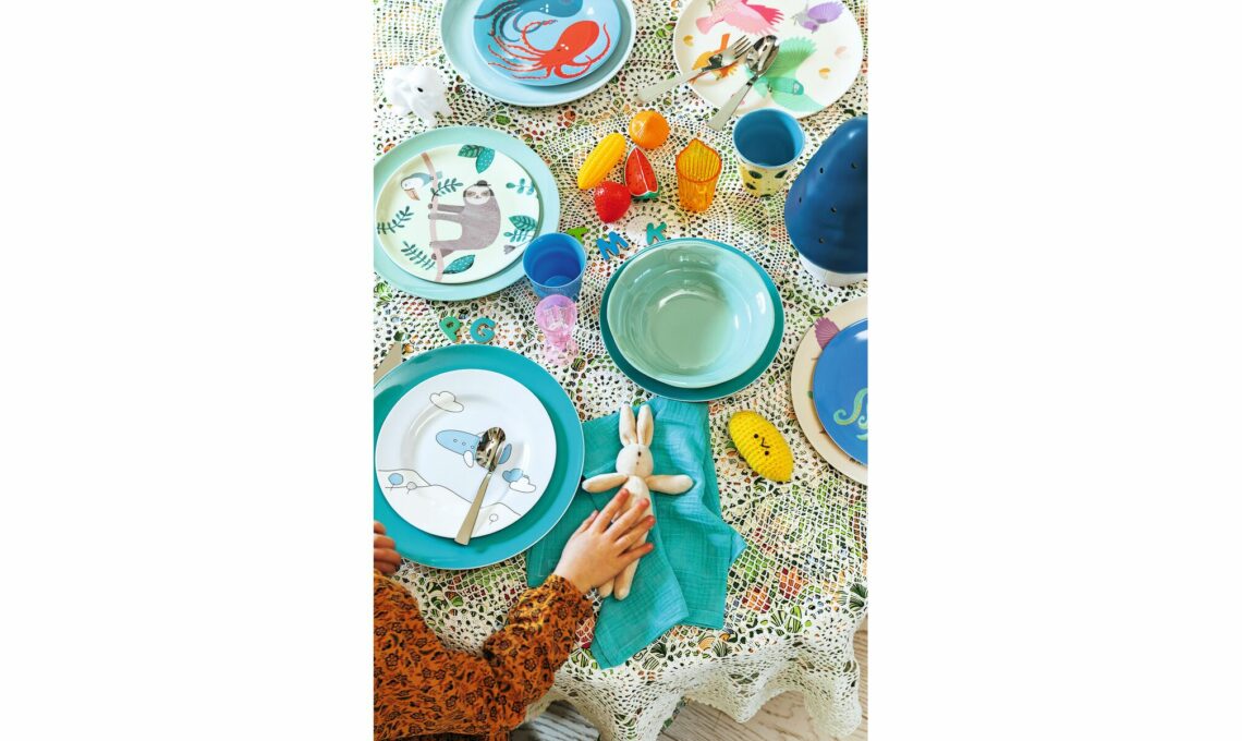 Sulla tovaglia all’uncinetto, piatto Blue Plane in porcellana [€39,90 il set con piano, fondo e tazza] e posate Gio Ponti Kidsin acciaio inox [€49,90 il set con cucchiaio, forchetta, coltello e cucchiaino tè], tutto di [Sambonet], più piatti colorati in melammina [Petit Jour Paris da Le Civette sul Comò €8,50 cad].