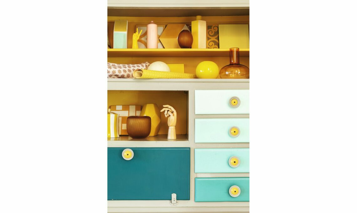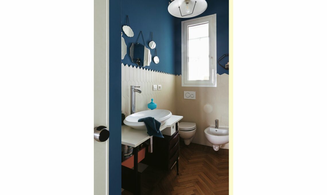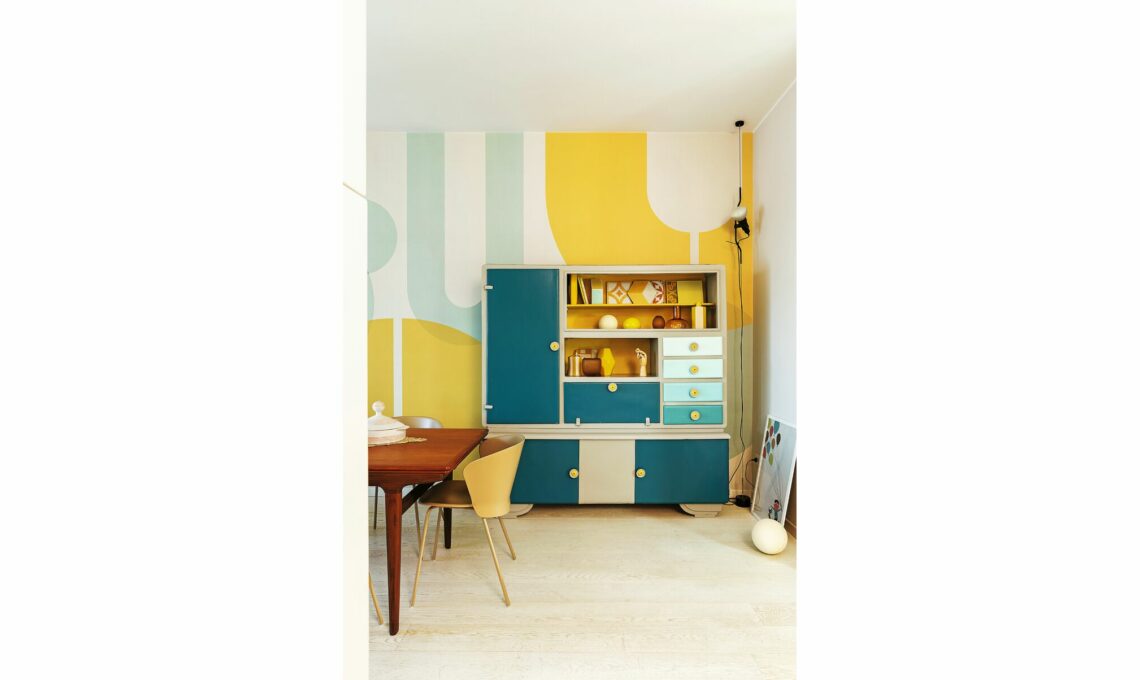 «La credenza ridipinta da Giorgia contiene tutti i colori che ritroviamo nei vari ambienti: il giallo è nel living, nella stanza dei ragazzi e nel loro bagno; l’azzurro in varie nuances è nella camera e nel bagno padronale; il bianco nel regno della piccola di casa, Anita».