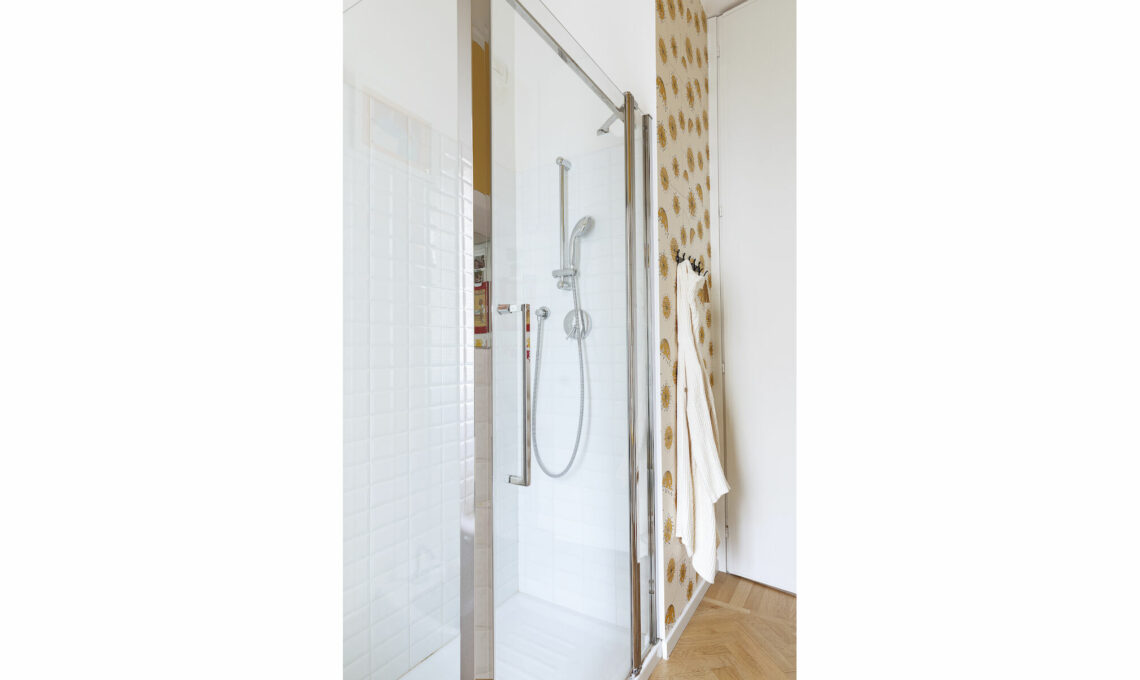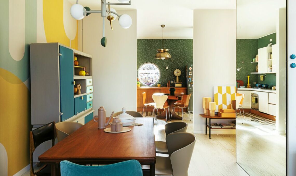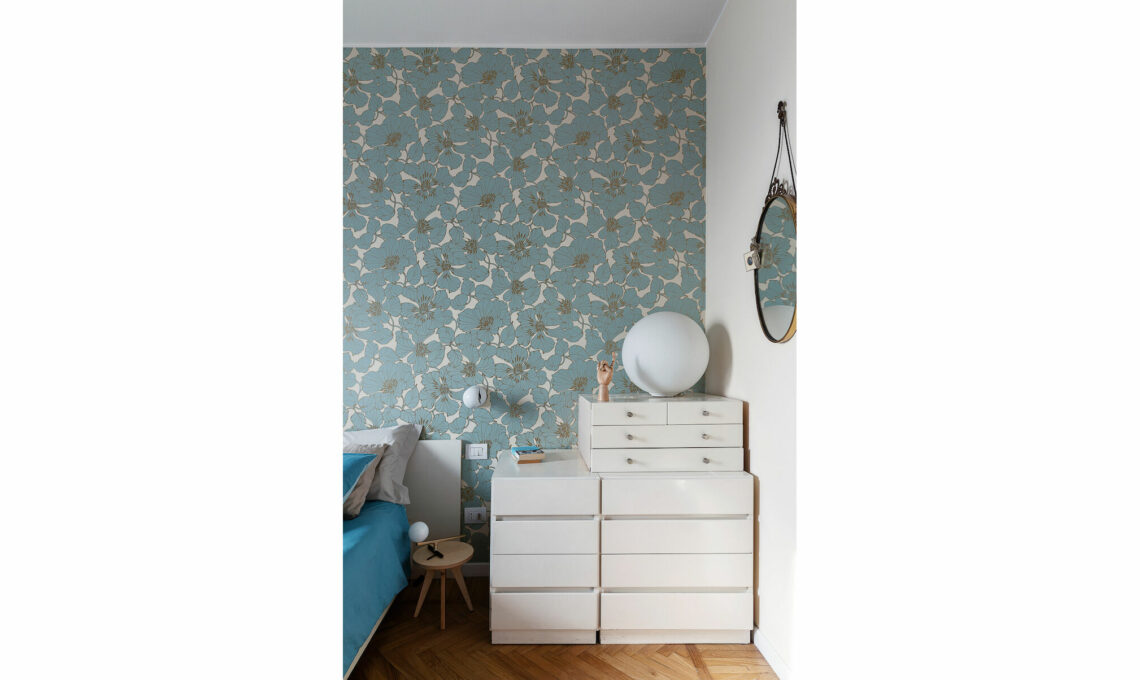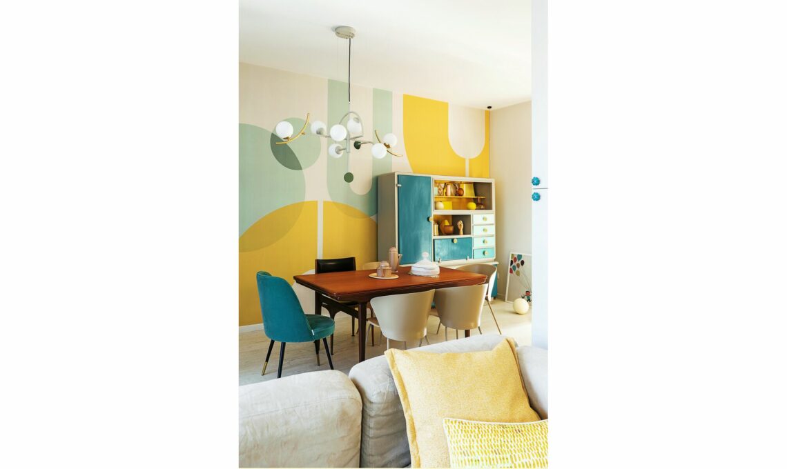 Si parte con la ristrutturazione che ha unito le due case creando la zona giorno con cucina in parte a vista da un lato e un’ampia zona notte con due bagni dall’altro. «Abbiamo riutilizzato alcuni arredi che avevamo e ne abbiamo conservati altri del vecchio proprietario, ma restavano degli angoli non risolti e volevo rinnovare qualche mobile dipingendolo», dice Giorgia che è stata molto attiva nelle scelte di stile: in ogni stanza ha voluto una carta da parati diversa perché diversi sono i suoi abitanti e le attività che vi si svolgono. «Però non riusciva a venire a capo della carta in soggiorno, la prima che si vede entrando in casa» dice Giovanna Fra, la stylist che l’ha aiutata. «Alla fine ne abbiamo scelta una totalmente diversa dalle altre, in stile Bauhaus a maxi disegni geometrici».