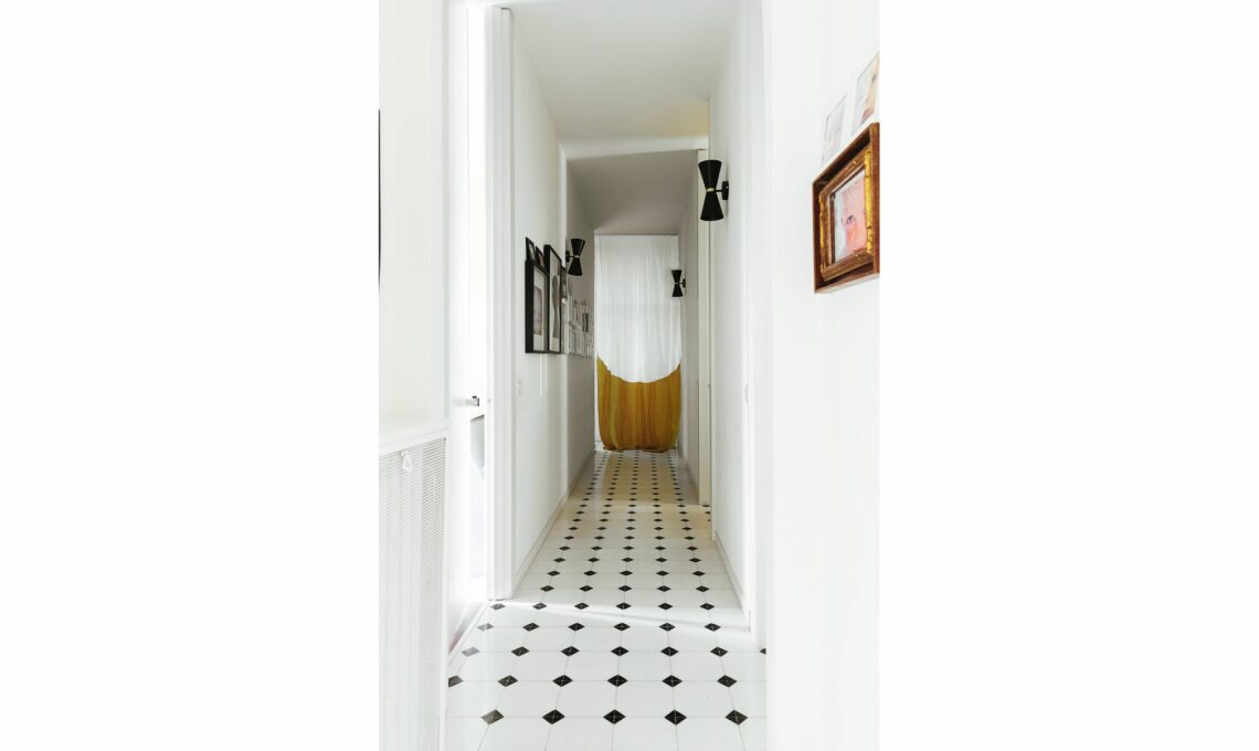 Lampade di ispirazione Fifties Ogilvy [su made.com, cm 13x16x30h €52,50 cad], sul fondo tenda in lino Porto Soleil [Elitis, cm 150x320h da €350] e cornici [Ikea]; a terra, cementine in bianco e nero [Cimenterie de la Tour].