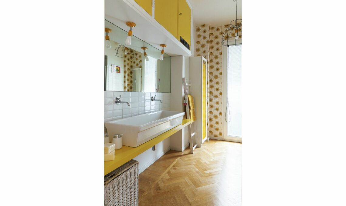 Carta da parati Dandelion Mobile Sunflower Yellow [Miss Print da Le Civette sul Comò €140 il rollo da cm 52x10 m], piastrelle bianche diamantate Metro [Leroy Merlin, cm 10x20 €14,99/mq], lampade orientabili gialle a soffitto [Filotto €39,90 cad].