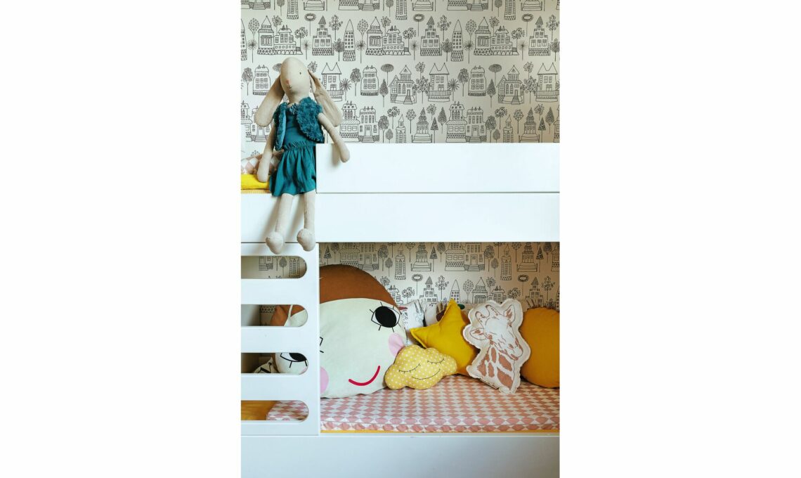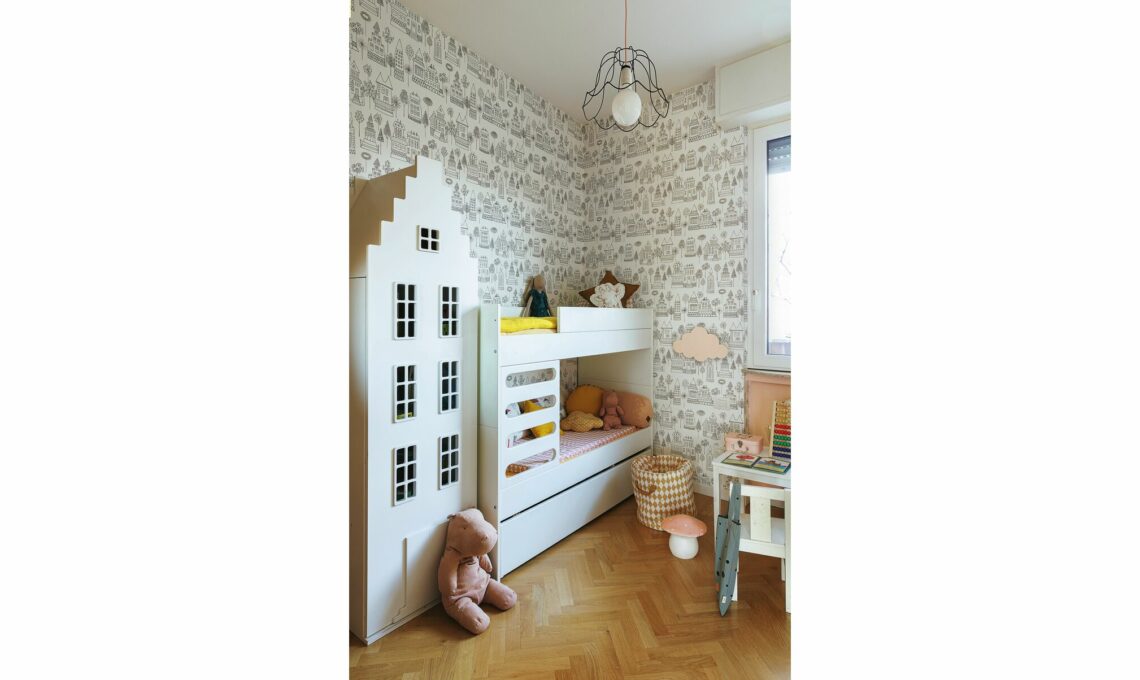 Tappezzeria con casette non più disponibile, ma simile c’è Pretty Lili Maison di [Caselio €42,50 il rollo da cm 53x10 m]. Tutto da [Le Civette sul Comò]. Sul letto inferiore, materassino gioco e cuscini fantasia.
