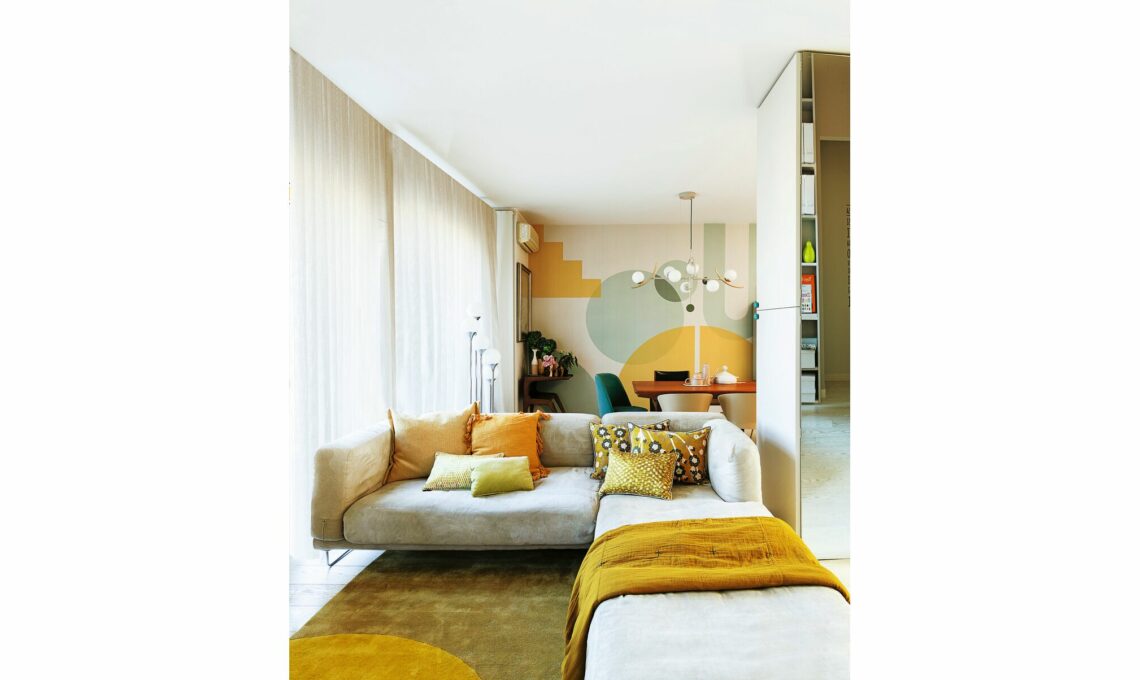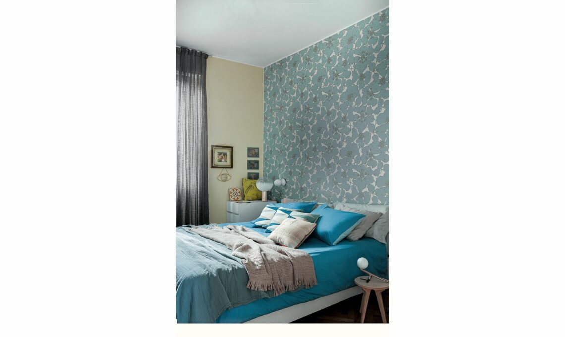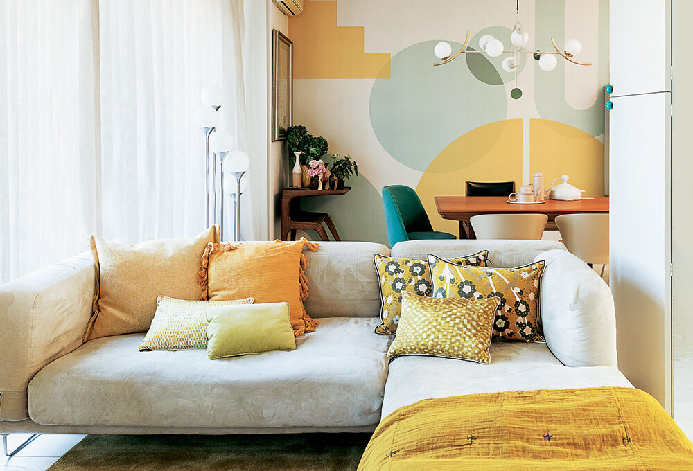 Tappezzeria Bilden [Hovia, da €45,60/mq]; sul divano, cuscini tinta unita e geometrici [Maisons du Monde e Design Republic], quelli a fiori in vendita da [Lo Studio Arredi]. Tappeto Teorema Hybrid [Amini, cm 300x200 €1.116]. Vicino alla finestra sulla console vintage, vasi [Ceramiche Milesi e Maisons du Monde] e fermacarte [Walter Fiori], tende realizzate con tessuto Nausicaa [Rubelli].