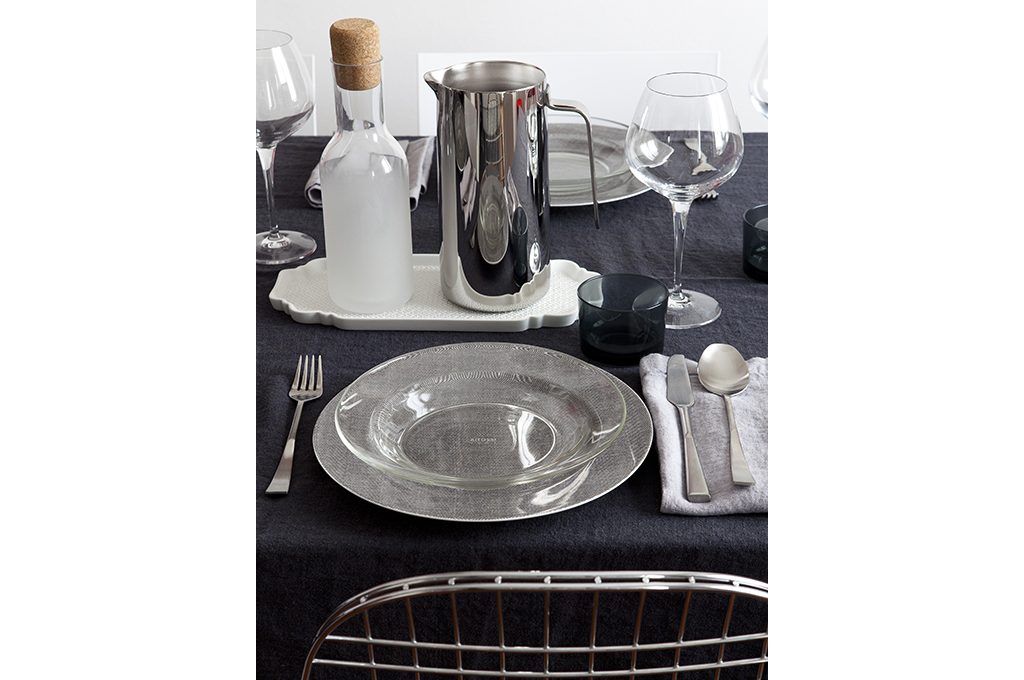 Tovaglia in lino [Coin Casa]; calici Symposium e bicchieri Bodega Mini [Bormioli Rocco]; posate in peltro [Mepra coll. Oro Nero]; bottiglia Frost con tappo di sughero [Stelton].