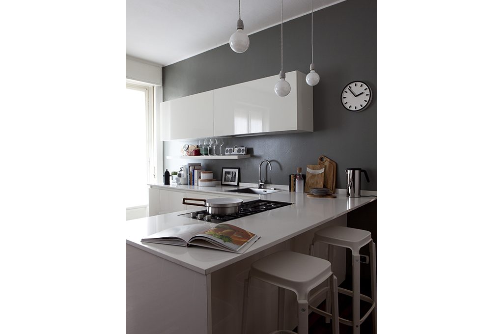 Cucina a L Axis laccata bianco lucido e top in quarzo Silestone [Zampieri]. Sgabelli alti Steelwood in lamiera bianca [Magis, cm 39x39x78h]. Sospensioni Muuto.