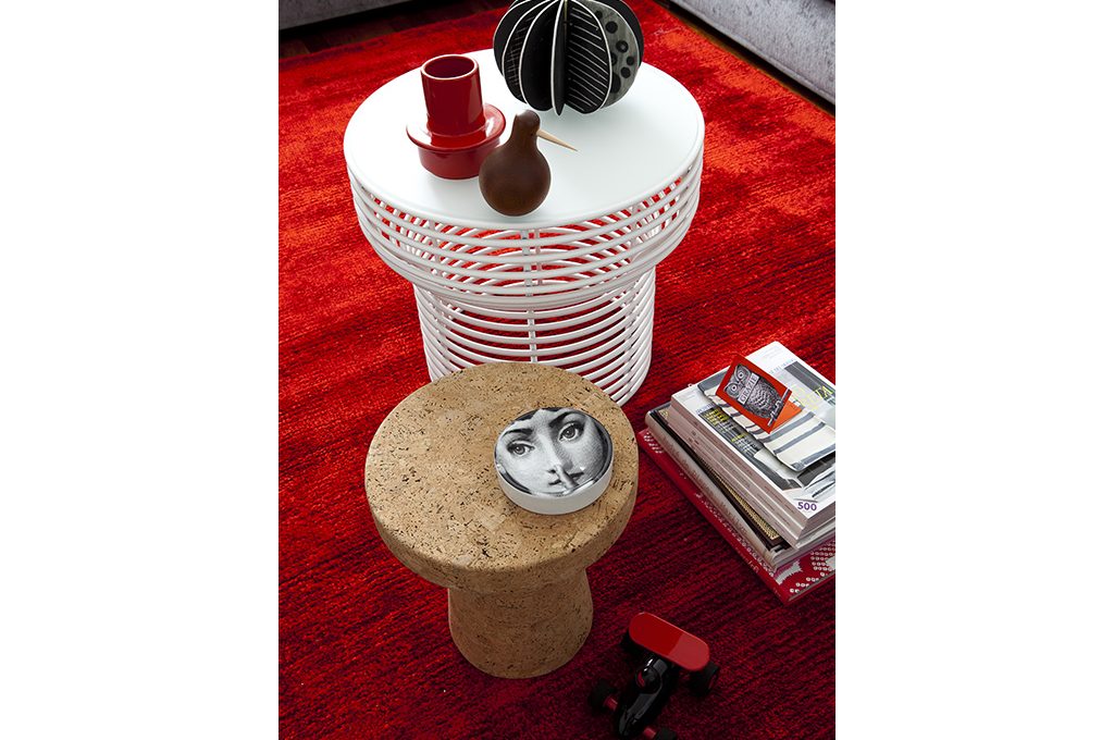 Niente pastelli, né mezzi toni o sfumature ‘naturali’: nel living trionfa la sfrontata dirompenza del rosso primario, in costante e geometrica opposizione con grigio e nero. Perché l’autentico segreto di stile, da riprendere, si cela nelle forme nette di tanti elementi: parallelepipedi, emisferi, circonferenze e rette si alternano sui profili dei mobili, sugli scattanti schienali delle sedute, sulle strutture in tondino d’acciaio. Una danza di linee che affascina con sobrietà, in abbinamento perfetto col caldo parquet.