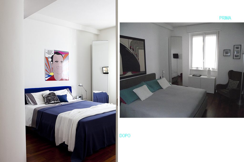 Senza sostituire il letto né gli altri mobili, la camera si veste di tutt’altro sapore foderando la testiera in un nuovo tessuto e adagiando sul materasso lenzuola morbide, un po’ oversize, che ricadono coprendo il giroletto (ottimo trucco se si amano i restyling in-men-che-non-si-dica). Proprio accanto alla porta, infine, s’innalza l’inedita cabina armadio: grazie a all’angolo ‘stondato’ si rivela poco invadente, perché non complica l’ingresso nella stanza.