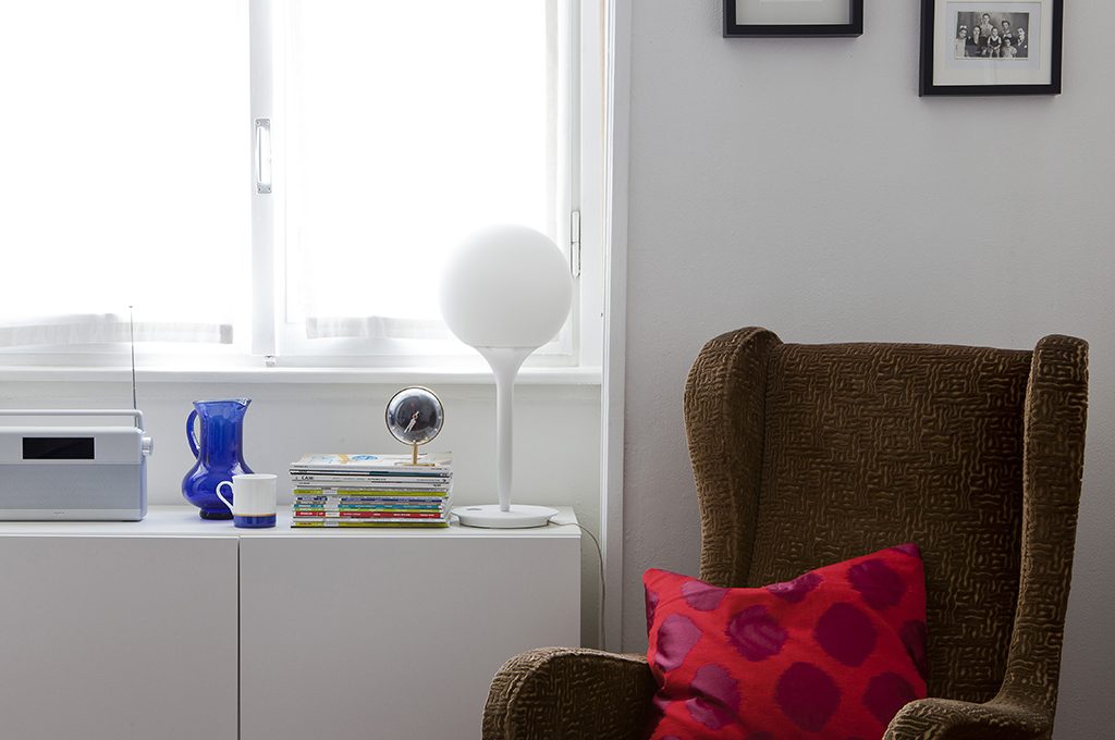 Vicino alla finestra poltrona vintage e cuscino rosso [Jab], accanto, luci da lettura Castore e Tolomeo [entrambe Artemide], orologio [Vitra], nell’angolo mobile a specchio [Ikea, cm 30x21x179h].