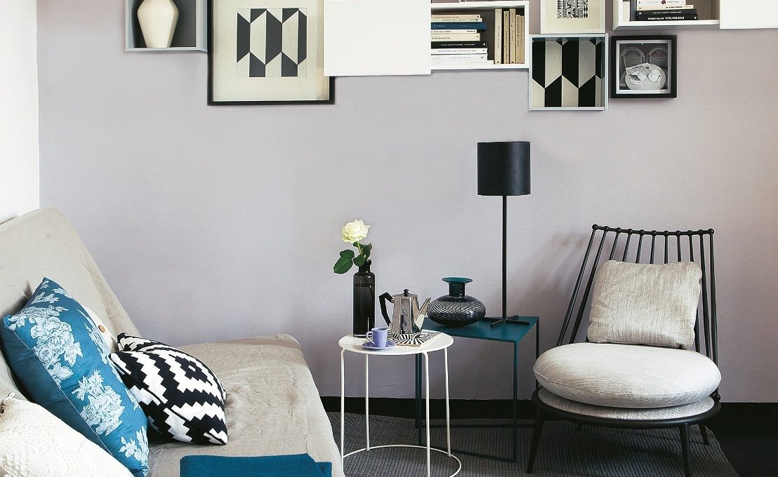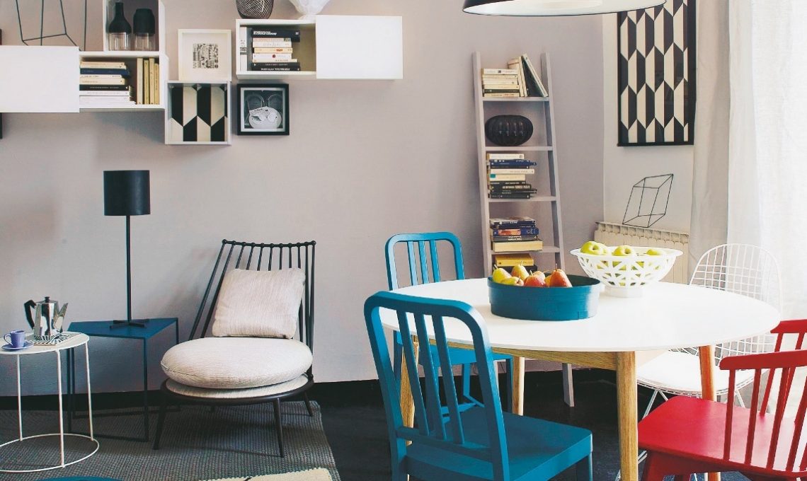Il grigio perla della parete del soggiorno è lo sfondo ideale per far risaltare i mobili pensili bianchi. Il tavolo è tondo e dalle dimensioni contenute: è in piena luce, davanti alla finestra. Questa soluzione ha svincolato la parete, lasciando più spazio a una mini zona relax con poltrona e tavolini.