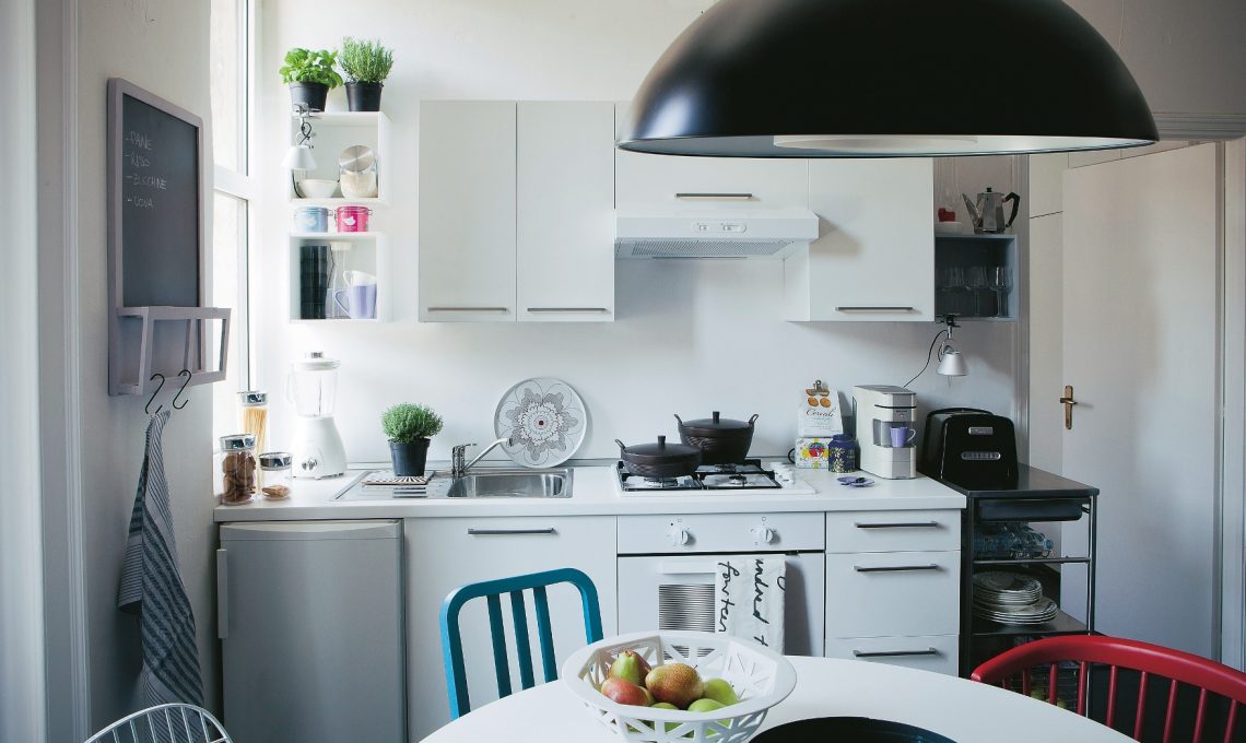 “Trovare una cucina total white è stata una botta di fortuna”, ci racconta la stylist, “spesso mi capita di intervenire su ante in finto legno che richiedono onerosi interventi di verniciatura”. CF ha consigliato di aggiungere solo alcuni piccoli contenitori a cubo accanto alla finestra più il carrello in acciaio e la lavagna a muro. Sul tavolo tondo, una grande sospensione nera a cupola.
