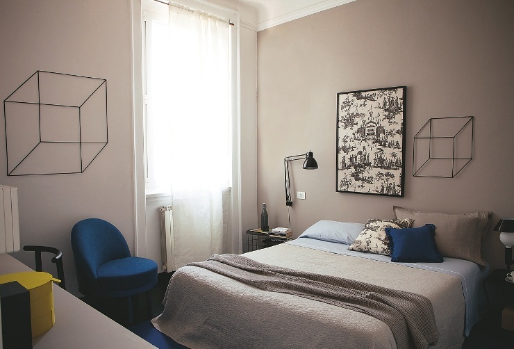 Il risultato è sorprendente, se si pensa che il letto protagonista della foto è lo stesso sommier di prima, messo nella stessa identica posizione. Mix di cuscini diversi, copriletto grey nella medesima tonalità della parete, luci importanti e pareti ‘vestite’ con pannelli decorativi e sculture in tondino di ferro fanno la differenza’ spiega Sara. Ora, finalmente nell’accostamento di tessuti, colori e materiali affiora l’anima della padrona di casa. Accanto alla finestra, c’è posto anche per una comoda poltroncina dalla linea avvolgente, rivestita in tessuto blu di L’Abbate.