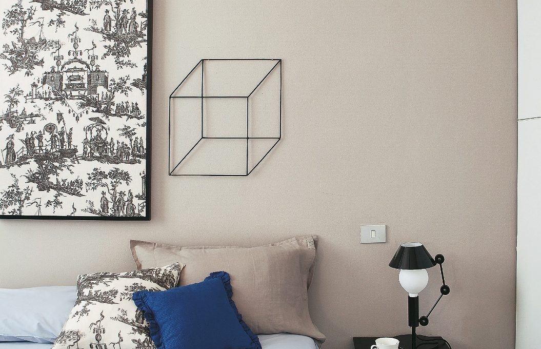 Rilassanti sfumature di grigio tortora invitano al sonno e danno serenità. Basta poco: oltre al colore della parete che viene ripreso nella biancheria minimal, l’attenzione si focalizza sul pannello in stoffa, realizzato da Vanessa, a motivi Toile de Jouy di Zoffany, uguale al cuscino. Un azzardo di certo ben riuscito è l’abbinamento con la scultura a ‘cubo’ di Antonio Sciortino. Accanto, il comodino in metallo nero e l’armadio doppia stagione di casa, completamente bianco.