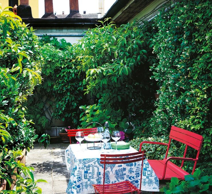 Sembra una giungla metropolitana, lo spazio outdoor (una sorta di patio davanti alla zona d’ingresso) condiviso con i vicini di casa dal pollice verde. Gelsomini, ortensie e glicini rivestono completamente le pareti. Esiste qualcosa di più rilassante del godersi il fresco, seduti a tavola, con gli amici? Per Sara no. Sempre in movimento, non rinuncerebbe mai a questo angolo idilliaco, a pochi metri dalla Madonnina, organizzato con mobili pieghevoli in metallo rosso di Ethimo.