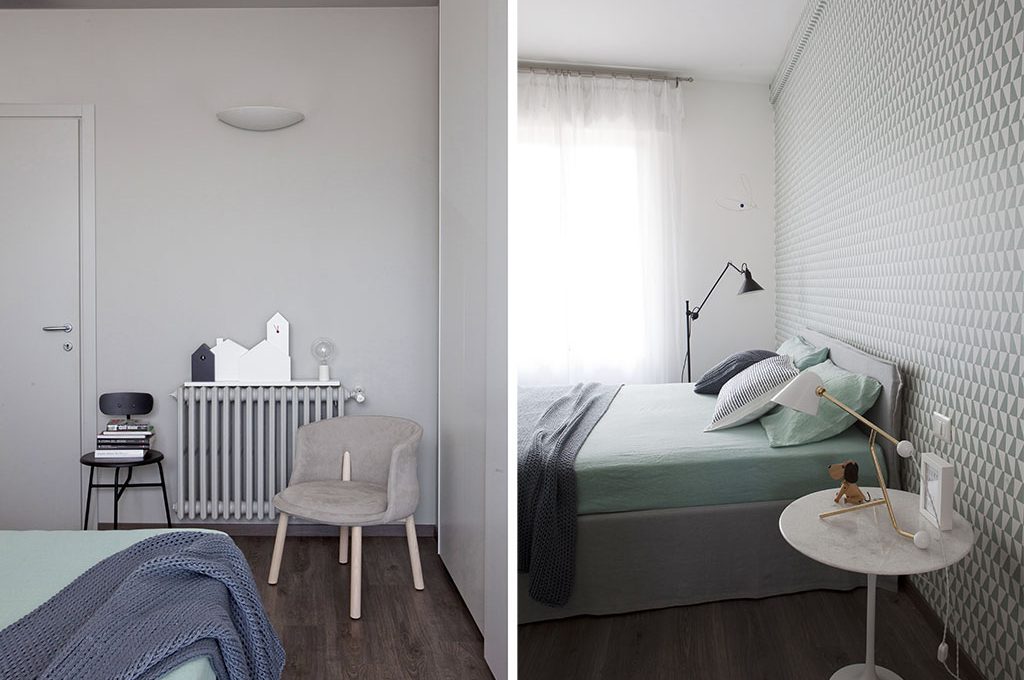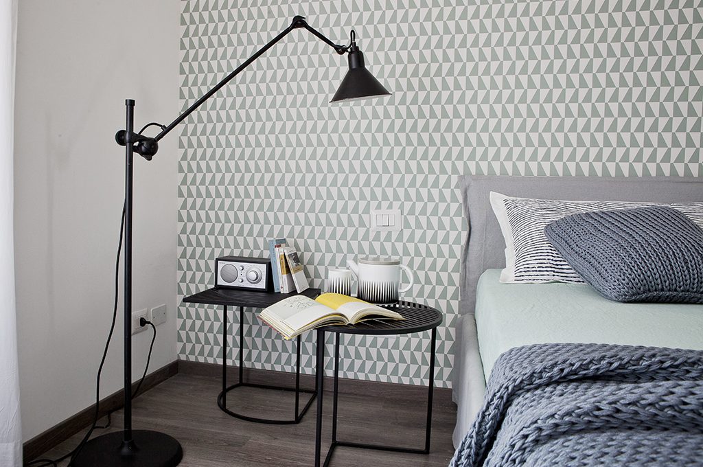 Nella camera da letto la carta da parati Trapez [Borås Tapeter, rollo da 10mx52cm €74], tavolini Iso A e Iso B [Petite Friture, ø cm 47x48h e cm 40x40x44h €245 cad]. Radio [Tivoli Audio], teiera e tazza [Ferm Living]. Copripiumino in lino di Interno 11 [Coincasa], federe Jean Paul [Zucchi, €69], plaid e cuscino tricot [Poemo Design €382 e €134]. Lampada da terra [Spotti].