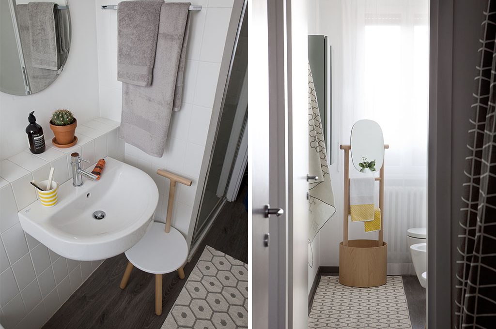 Bagno dal sapore nordico: sgabello [ø cm 38x81h €600], totem multifunzione con specchio [ø cm 40x90h €1.010], entrambi di Ever by Thermomatt. Asciugamani [Zucchi], sapone [Aesop], passatoia [Pappelina, cm 70x225 €158].