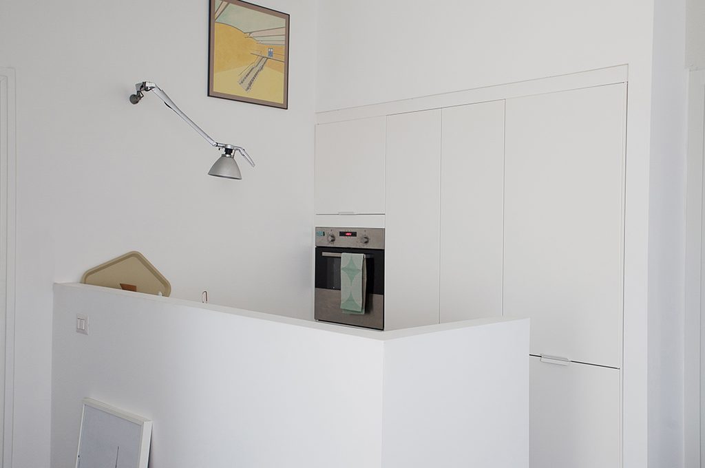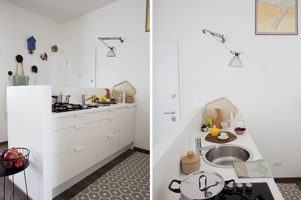 La cucina, che prima era un micro-angolo cottura, ora grazie al progetto di Federica permette di lavorare in tutto relax. Per sfruttare al meglio lo spazio, è stata organizzata su due fronti: lungo la parete ci sono le colonne frigo-forno-dispensa, sulla penisola la zona operativa. Il bianco totale (su pareti e mobili) dona più luminosità a questa zona senza luce diretta.