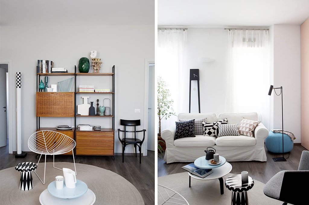 A sinistra: libreria Anni '50, vasi e oggetti décor [Bosa, Internoitaliano, Kose e Incipit Lab]. Piantana Ciminiera F2 [Rotaliana]. A destra divano Ektorp [Ikea, cm 179x88x88 €379], cuscini vari [Vitra, Poemo Design, Larsen, Ferm Living]. Poltroncina Cut e pouf Kipu [La Palma da €457 e da €567]. Lampada da terra Nomad [Rubn €650]. Orologio Tiuku [Covo €207].