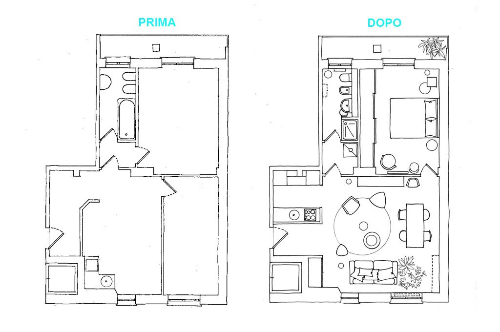 La pianta dell'appartamento prima e dopo gli interventi di ristrutturazione. È stata abbattuta la parete tra ingresso, cucina e camera, ricavandone un grande living.