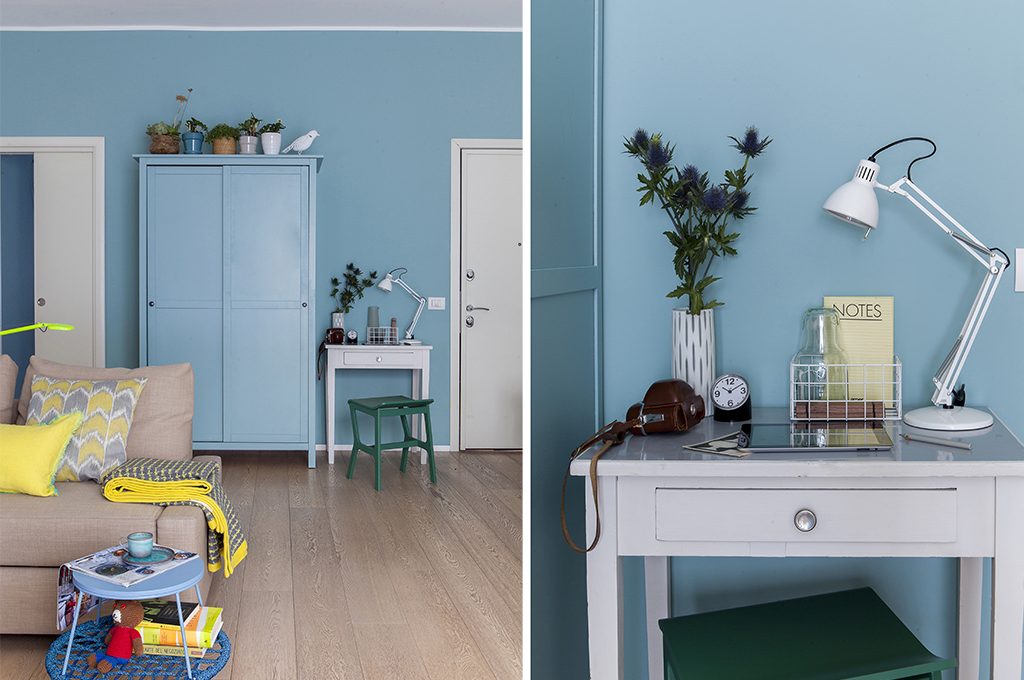 Armadio Hemnes [Ikea, cm 120x59x197h €299] è stato tinto dello stesso azzurro del muro [P1.11.63 di Sikkens]. Sopra, uccellino [Zara Home] e porta vasi [Coincasa]. Tavolo vintage, con sgabello Ninho [Trabà €341], lampada JJ Junior [Leucos].