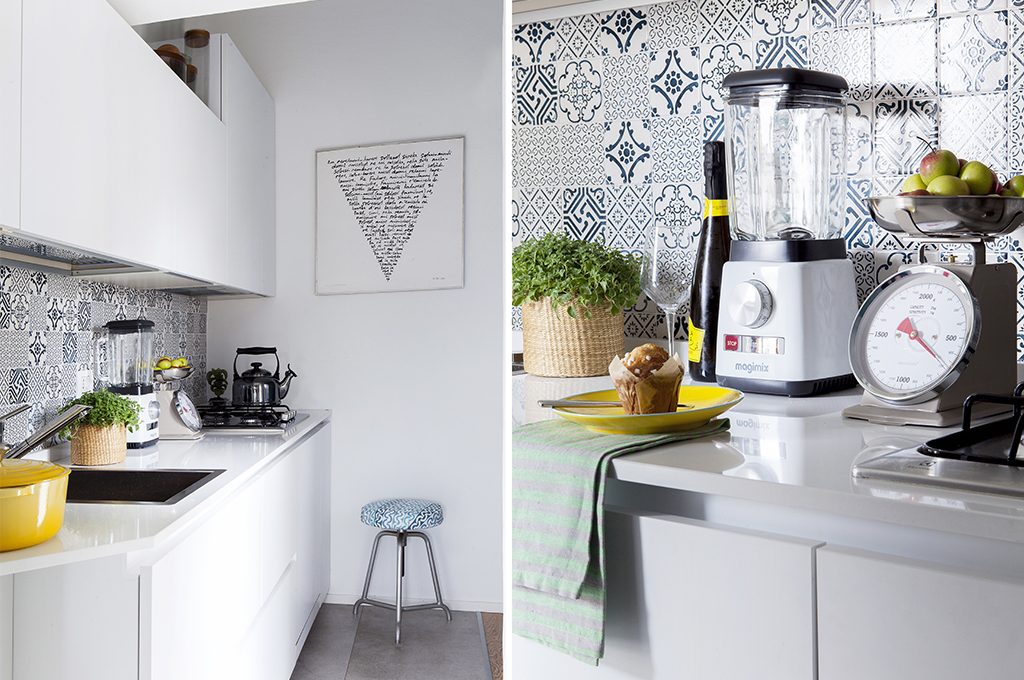 Frullatore [Magimix €200], cocotte e bollitore [Le Creuset, €109 e €89], bilancia [Brandani]. Piastrelle a parete [Made a Mano], e a terra [Sil Ceramiche].