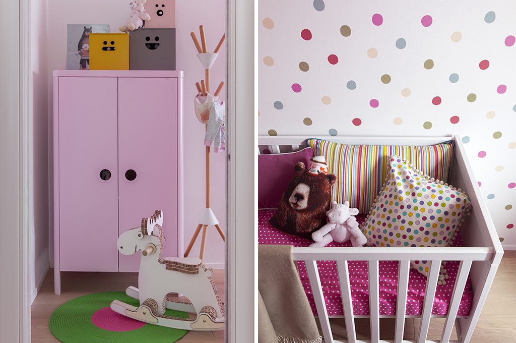 Armadio Busunge rosa [cm 80x52x139h €119,90] di [Ikea] come il tappeto Stickat [€9,99] e il lettino Sundvik [cm 60x120x84,8h €119,90], scatole [Ferm Living su taninihome.com €205 il set da 3]; attaccapanni Pierrot [Alessi €185] e alce dondolo [Davide Paganotti €149].