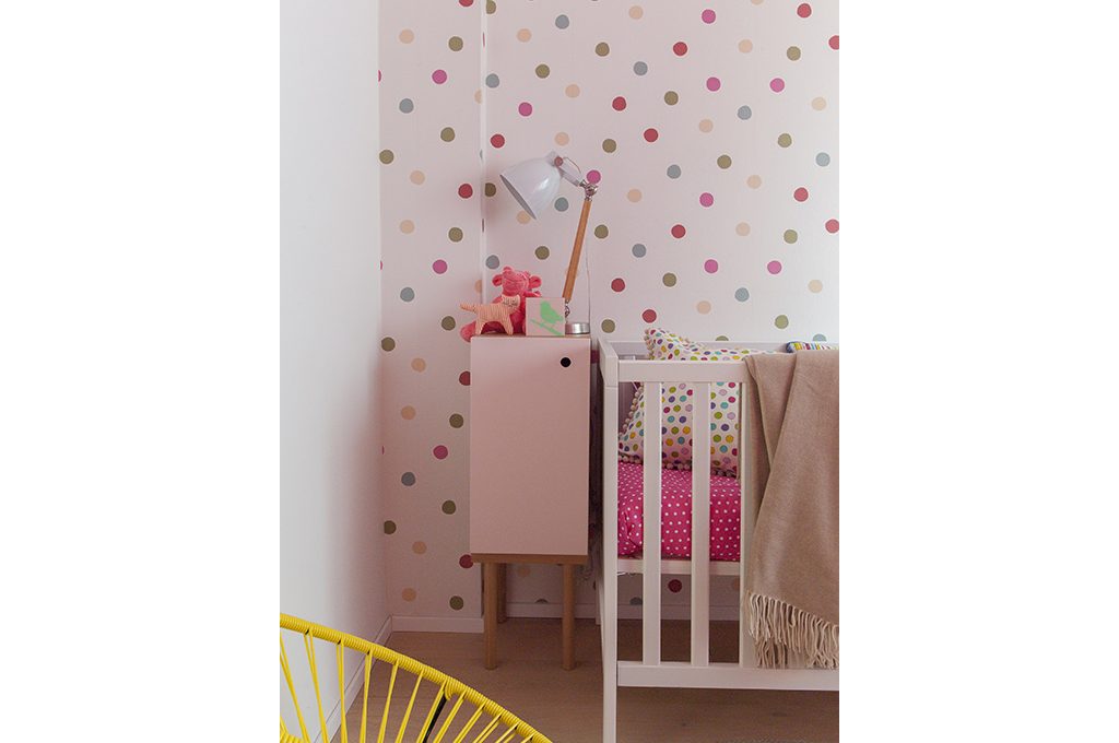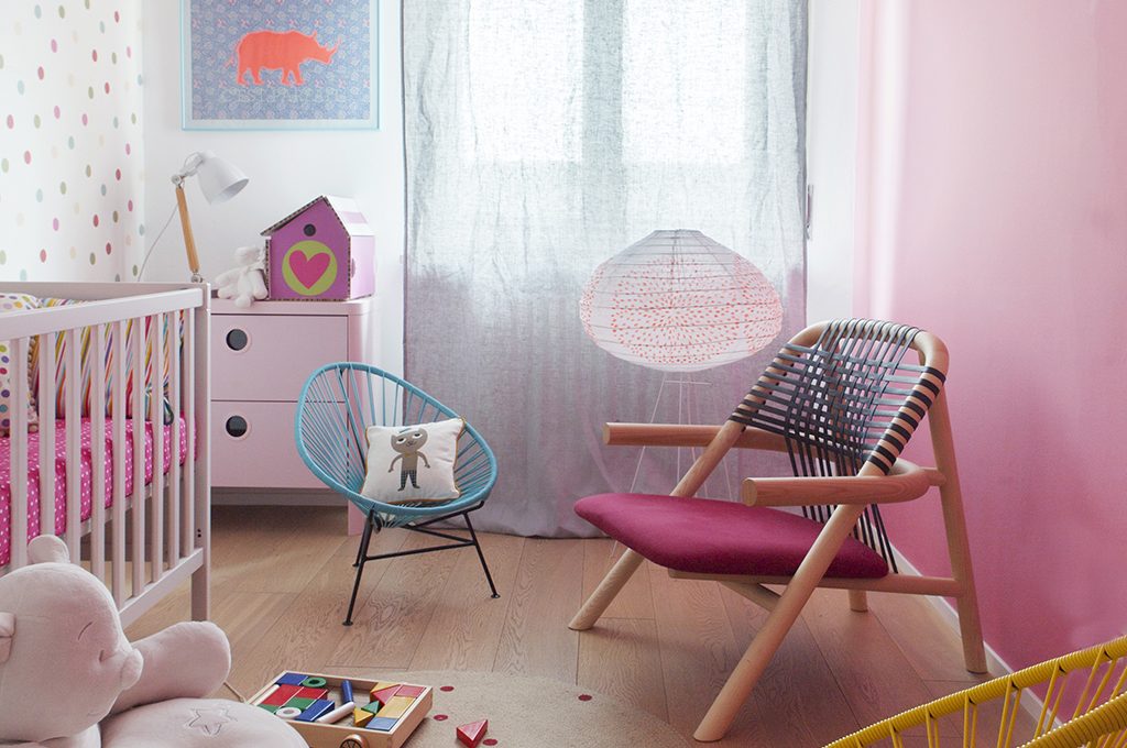 Per la cameretta della loro bambina, i proprietari cercavano una soluzione che potesse andare bene per i primi anni e che, con poche modifiche, si potesse adattare alla sua crescita. Per rendere più giocosa e accogliente la stanza, ci sono tante poltroncine small e large e le pareti lunghe sono una fucsia e una a pois.
