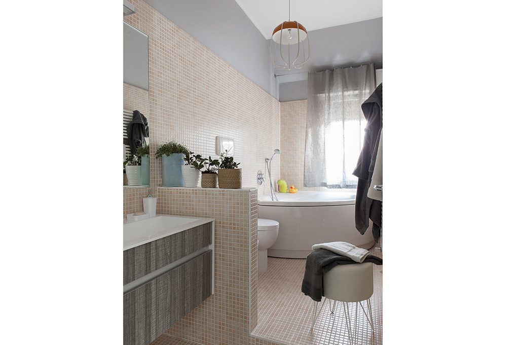 Il bagno principale era stato ristrutturato di recente, ma con un gusto un po’ anonimo. Cambiando lo stretto necessario e aggiungendo qualche tocco di grigio al color pesca del mosaico e arricchendolo di dettagli moderni. Il rivestimento effetto mosaico rosa pesca non convinceva molto ma rimuoverlo per sostituirlo sarebbe stato inutilmente dispendioso. Così la nostra stylist ha suggerito di dipingere la fascia tra le piastrelle e il soffitto in grigio cemento... è bastato questo, con l’aggiunta di accessori in nuance, a cambiare volto al locale.