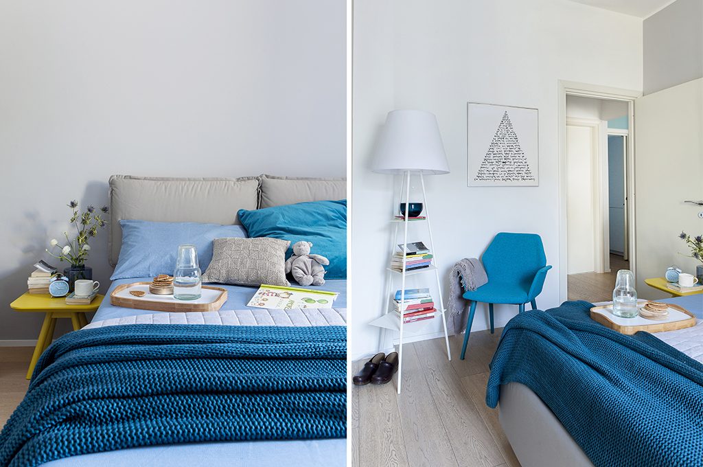 Spirito minimal e sfumature del blu, accostate a bianco e grigio. I colori del letto vengono ripresi sulla poltroncina del mini angolo lettura, un piccolo sogno della proprietaria di casa.